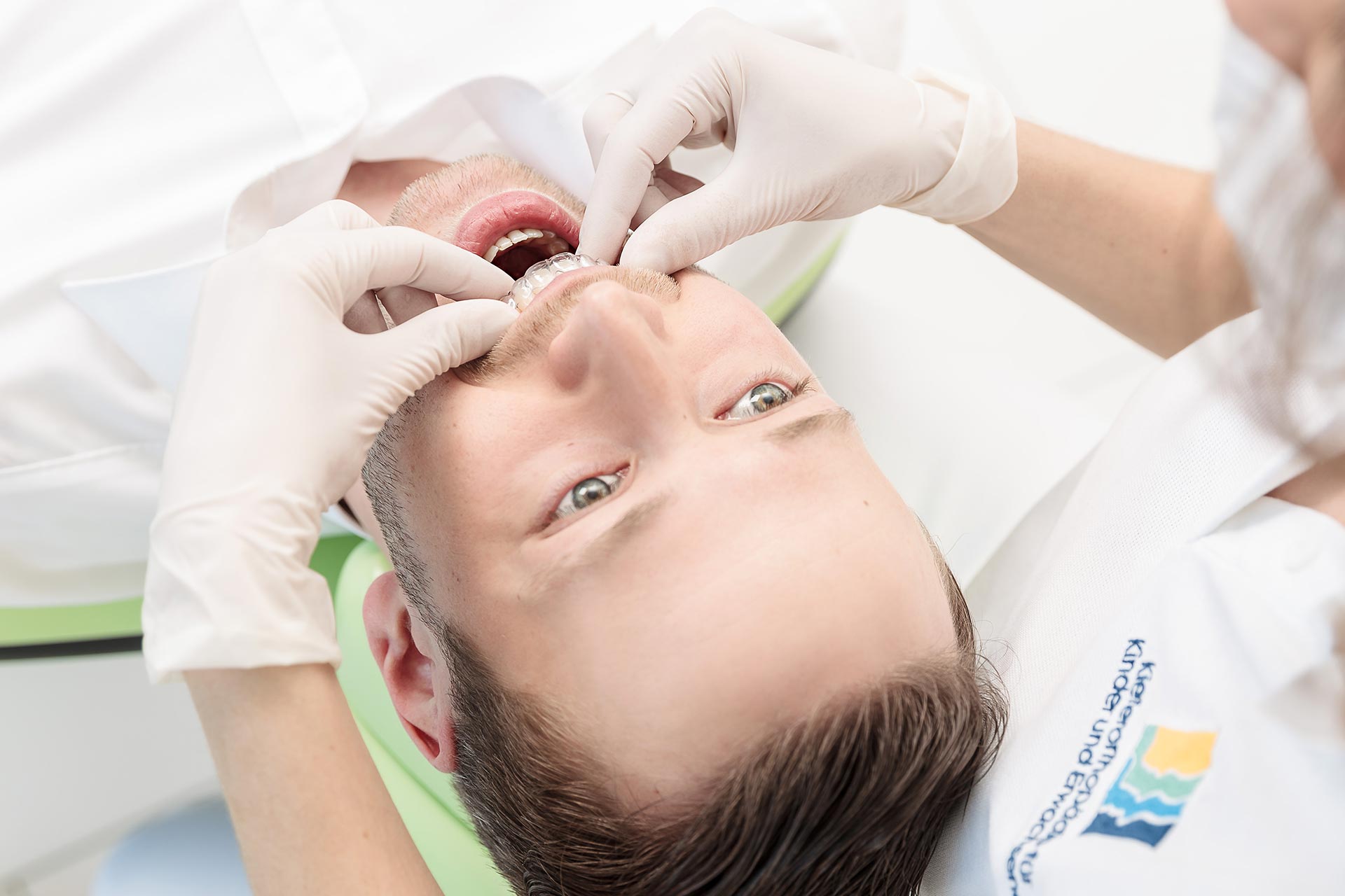 Bereits aus kurzem Abstand ist die Behandlungsschiene im Mund praktisch unsichtbar. Im Gegensatz zu einer festsitzenden Apparatur mit Brackets und Drähten kann der Patient die Schiene herausnehmen, um zu essen oder die Zähne zu pflegen.